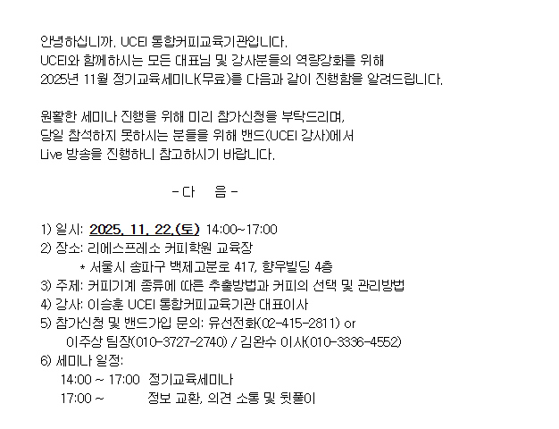 UCEI 2025년 11월 정기교육세미나 안내(커피기계 종류에 따른 추출방법과 커피의 선택 및 관리방법)